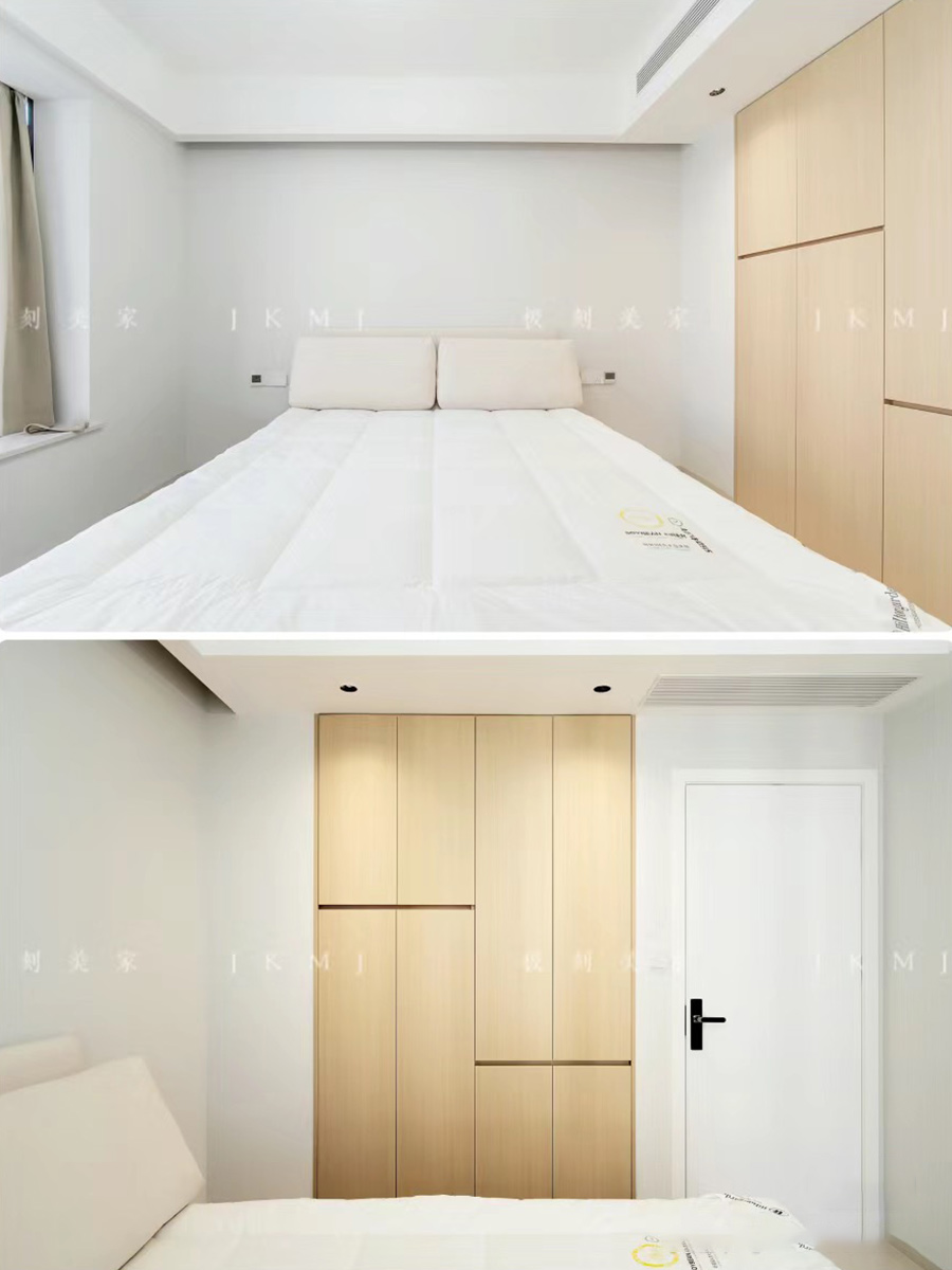 臥室延用整體色系,全屋同款同色同造型,做滿墻衣柜,滿足收納需求
