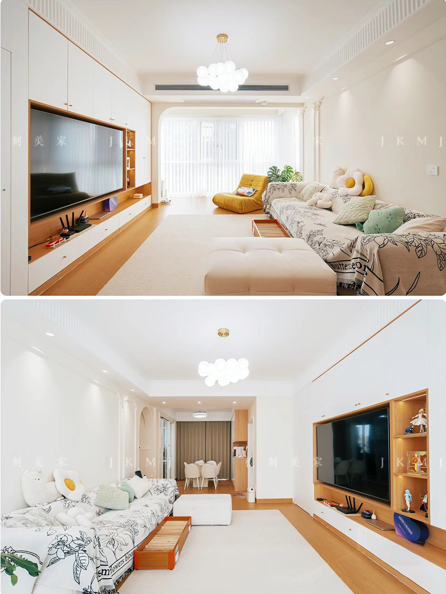 做滿墻電視背景柜和餐邊柜,滿足收納的同時兼具顏值