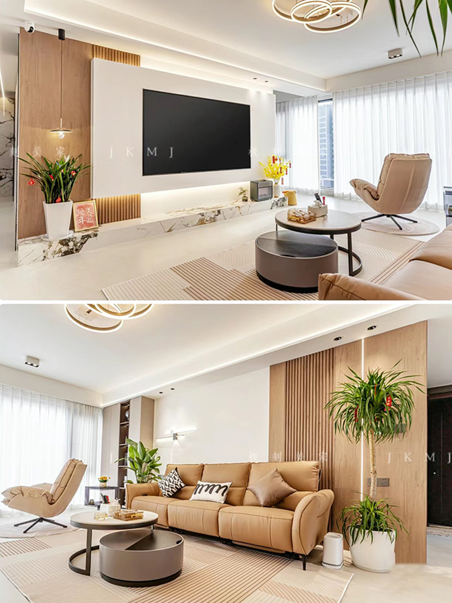 電視背景墻和沙發(fā)背景墻都采用木飾面設(shè)計,簡單又有設(shè)計感