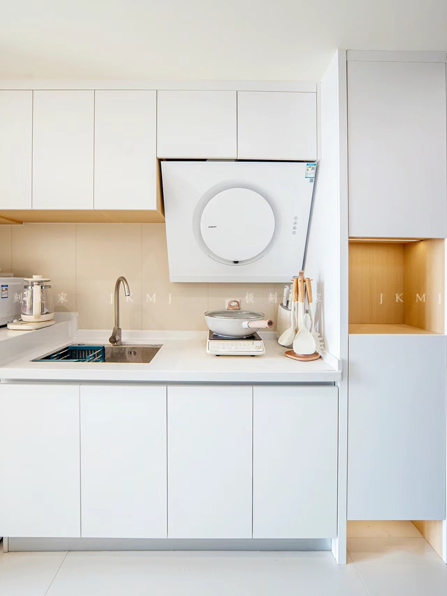入戶做開放格鞋柜+開放式廚房,充分利用空間,顏值與收納并存