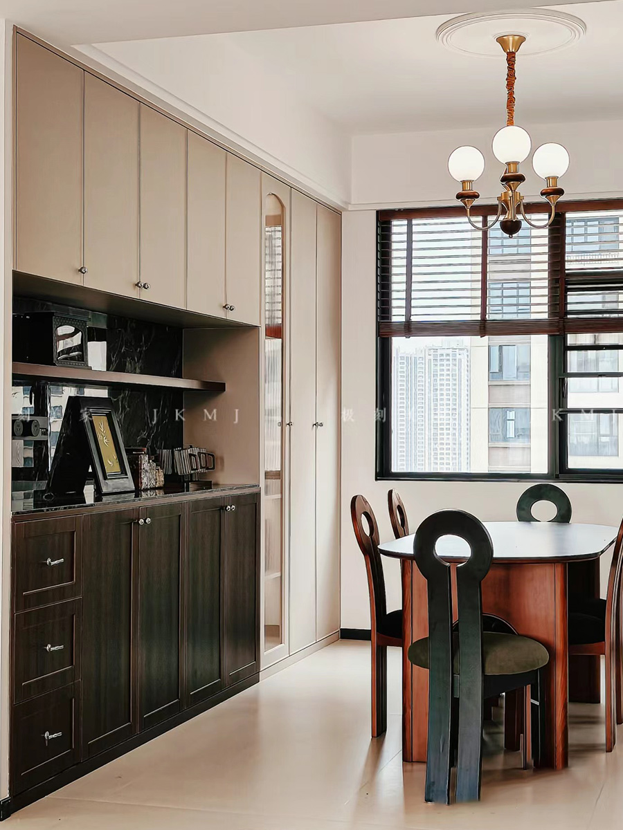 餐邊柜深淺搭配,綠巖板的融入,使整體更有層次感