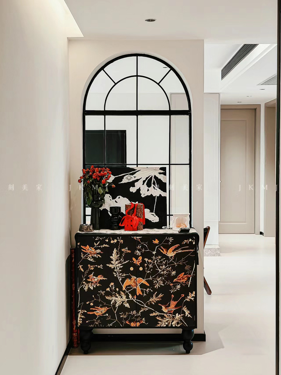 入戶做玻璃屏風(fēng)加古著收納柜,轉(zhuǎn)角利用空間做弧形展臺(tái),讓回家充滿儀式感
