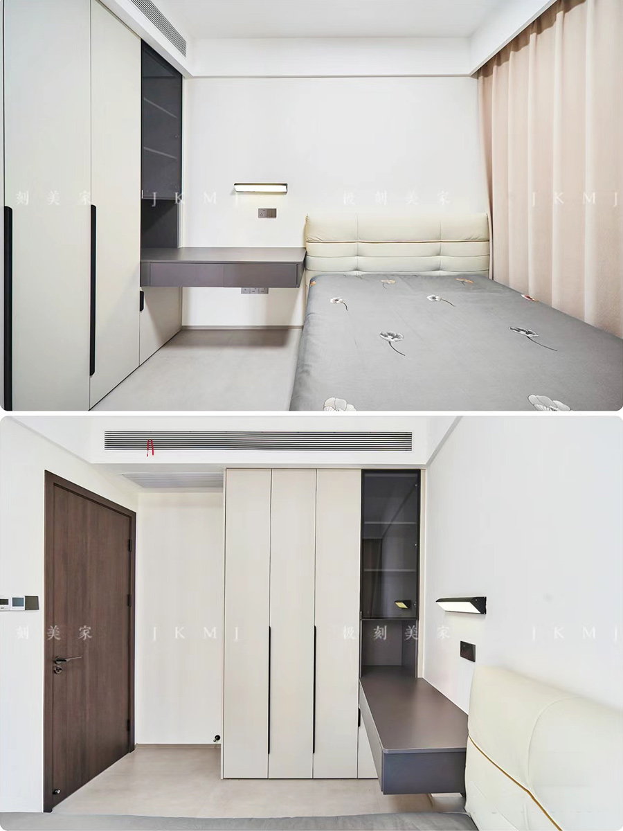 臥室摒棄床邊柜設(shè)計(jì),做書(shū)桌衣柜一體化,顏值收納兩不誤