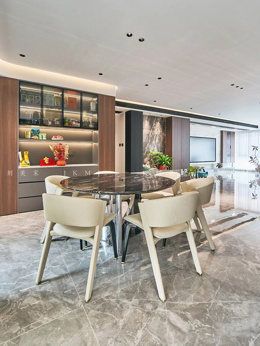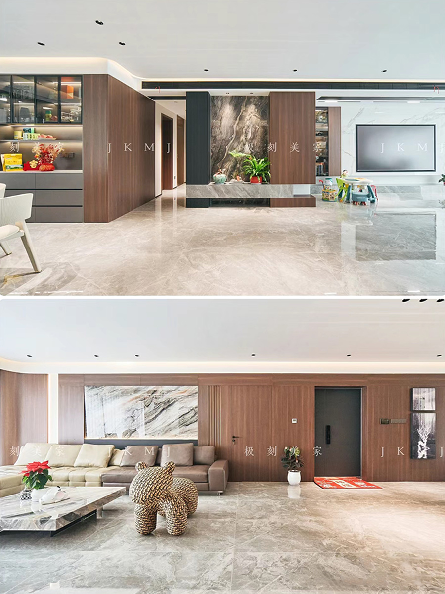 沙發(fā)背景和電視背景均采用巖板設(shè)計(jì),簡單又充滿設(shè)計(jì)感