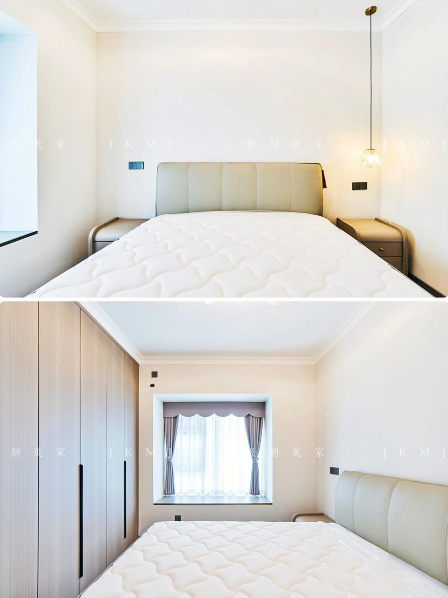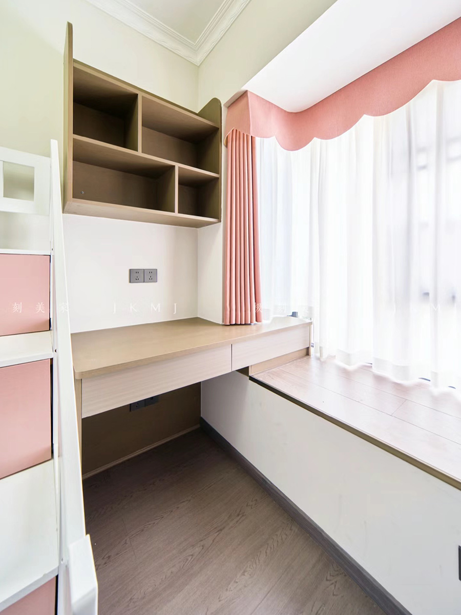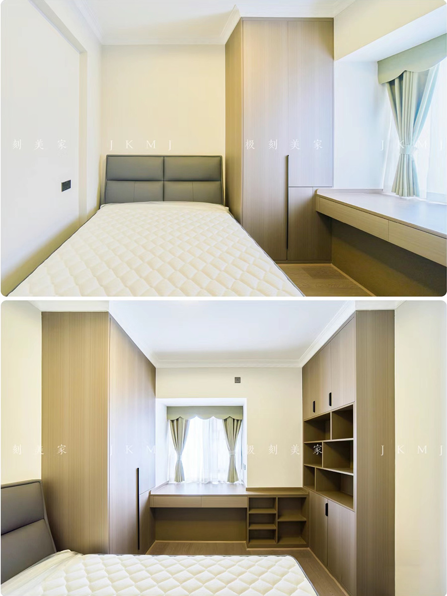 臥室柜做衣柜+書桌設計,充分利用空間,滿足業(yè)主的收納需求