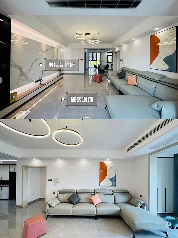 客廳、餐廳、廚房、陽臺都是用大塊淺灰色亮面磚通鋪,無波導(dǎo)線,用灰色美縫,幾乎看不到縫隙,地面整個貫穿,視覺上更亮堂顯大