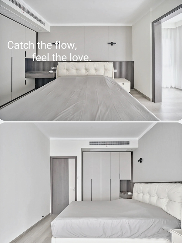 全房共定制了10個柜子,柜體采用足18厚杉木芯板,柜門采用LSB板PET膚感柜門,一門到頂,五金使用原裝進口的百隆五金