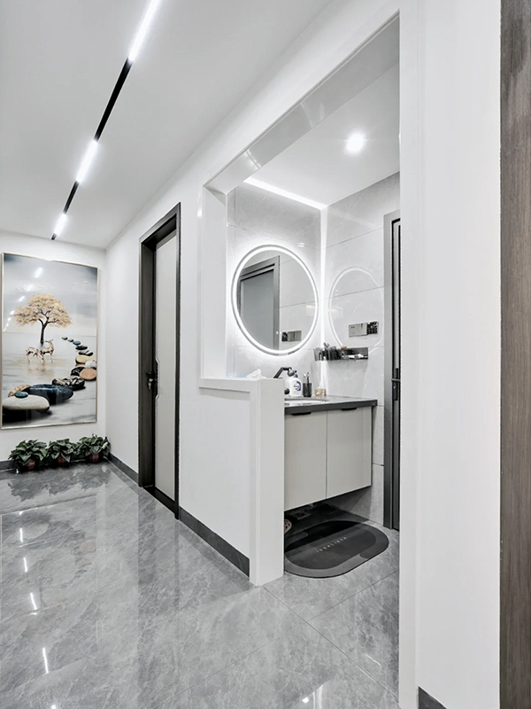 馬可波羅大板磚、箭牌衛(wèi)浴、圣象地板、以及與全房定制衣柜同款同色同造型的定制房門和鋁合金門、恒潔潔具、西門子開(kāi)關(guān)等