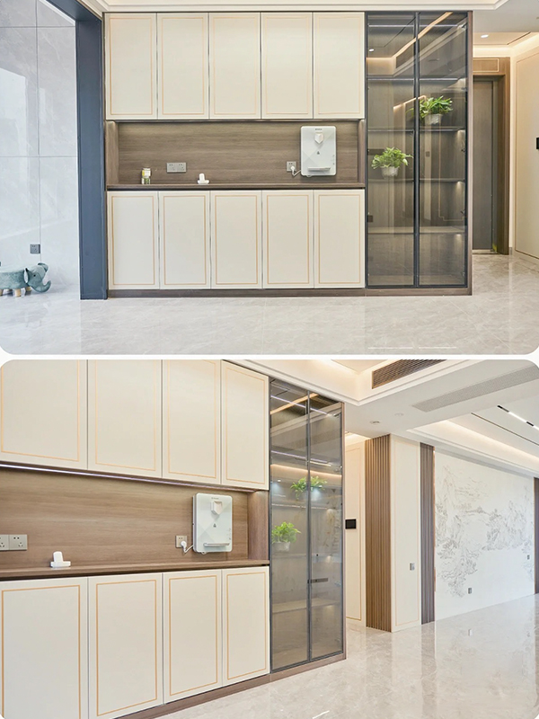 ?全屋定制:柜體板材是十環(huán)認證萬象天冠足18厚杉木實芯板,柜門做的是歐松板模壓門;五金是奧地利進口百隆五金、徹底實現(xiàn)門墻柜一體化;