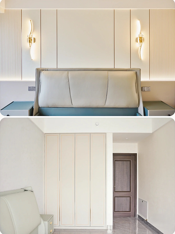 門墻柜一體化,象牙灰柜門鑲嵌金屬邊框,與柜門同款式,尤加利護墻板同色配套房門柜體更顯精致統(tǒng)一