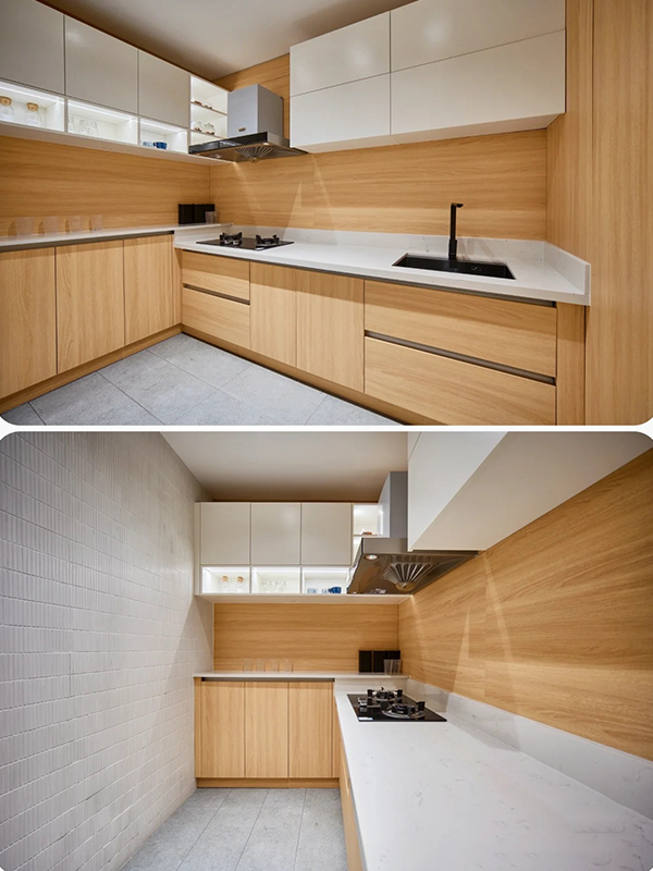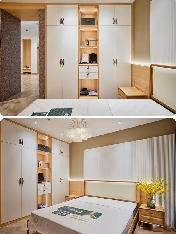 全屋定制:柜體板材是十環(huán)認證萬象天冠足18厚杉木實芯板,柜門做的是歐松板模壓門;五金是奧地利進口百隆五金、徹底實現(xiàn)門墻柜一體化;