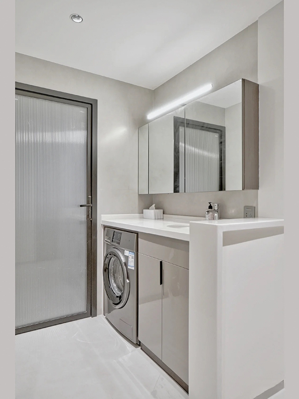 馬可波羅大板磚、箭牌衛(wèi)浴、圣象地板、以及與全房定制衣柜同款同色同造型的定制房門和鋁合金門、恒潔潔具等