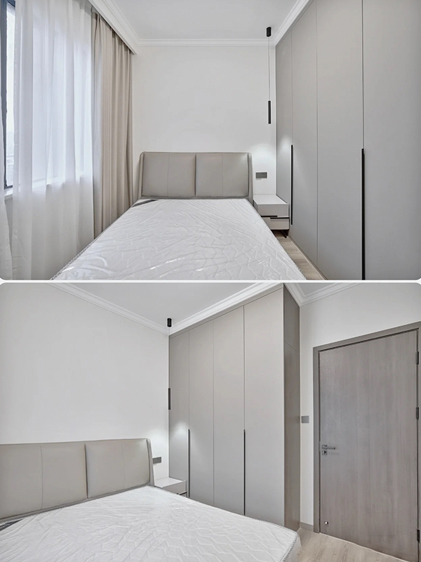 全房共定制了6個柜子,柜體采用足18厚杉木芯板,柜門采用LSB板PET膚感柜門,一門到頂,五金使用原裝進口的百隆五金
