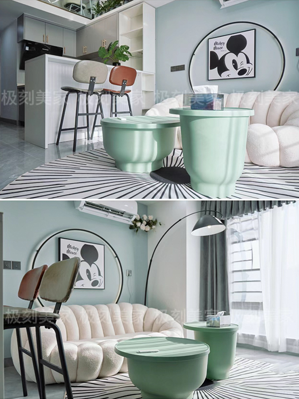 乳白色面包型沙發(fā)搭配湖藍(lán)色茶幾,時(shí)尚感upup