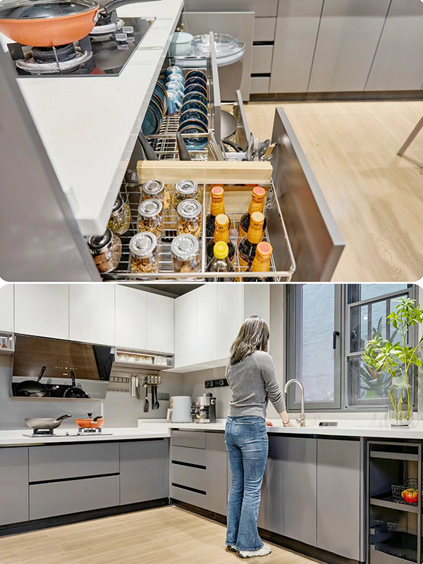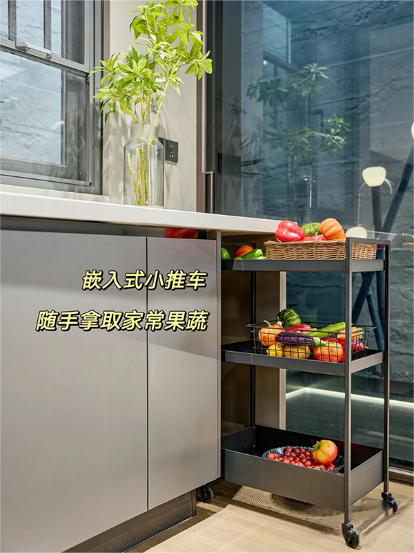 在烹飪區(qū)左手位置設(shè)置一個抽拉柜,各種調(diào)味品囤貨都可以整齊擺放在這里。拿取順手方便。備菜區(qū)臺盆留出位置放一個小推車,日常蔬果直接放這里也不占地方。