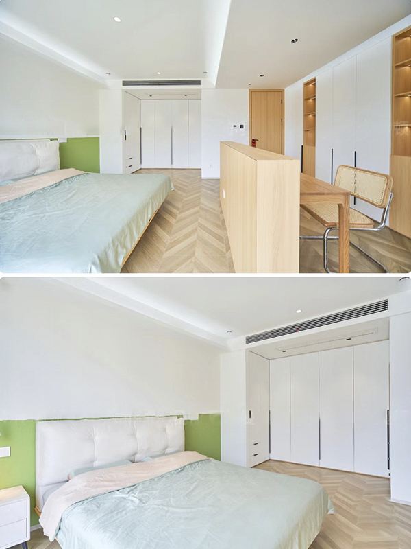 臥室小的話建議將衣柜?床頭柜一體式設計,不會擋柜門。