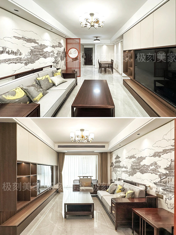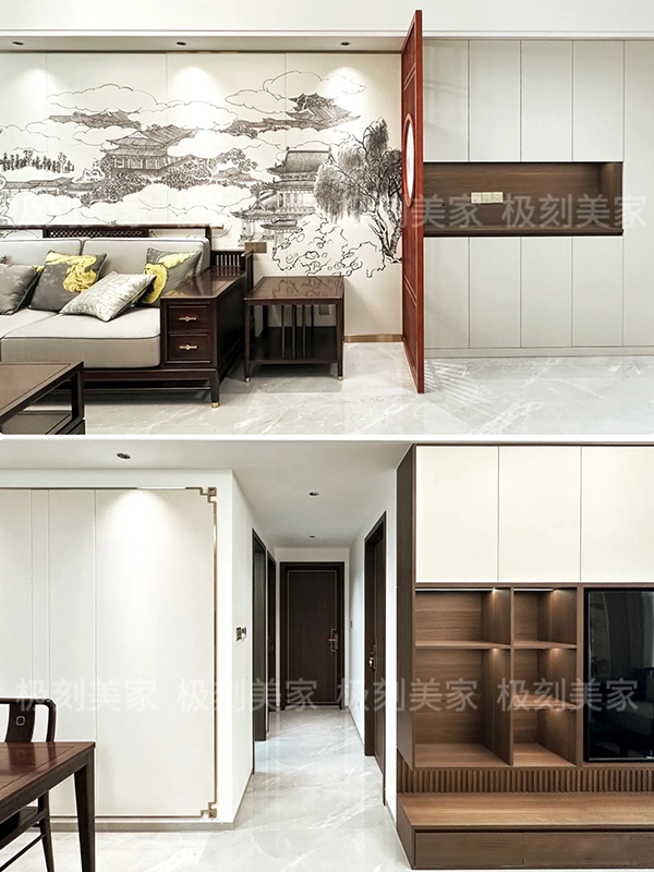 入戶柜與客廳用紅色屏風隔斷,連接水墨畫背景,余韻十足