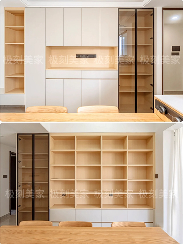 運(yùn)用玻璃柜門和木質(zhì)柜門相結(jié)合的設(shè)計(jì),增加層次感