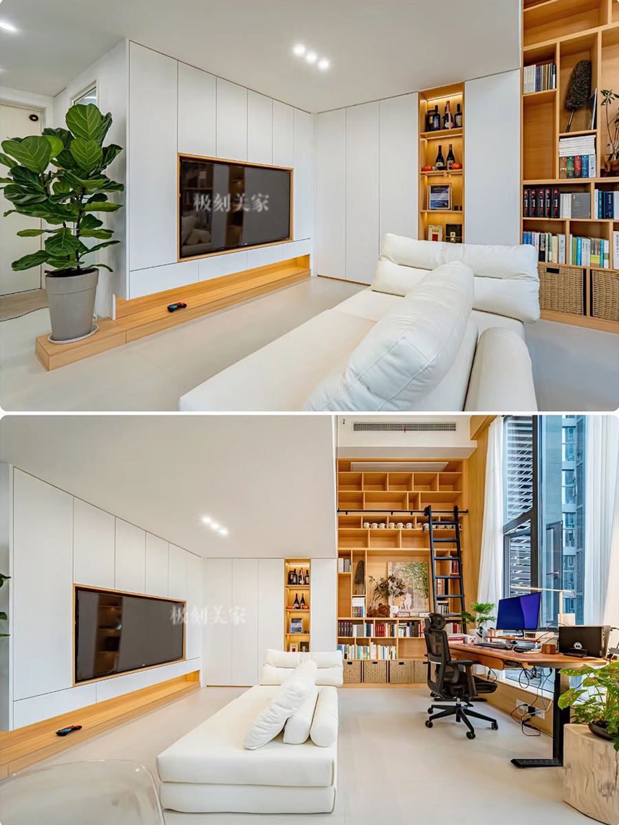 滿墻電視背景墻連接整墻書柜,顏值與收納并存