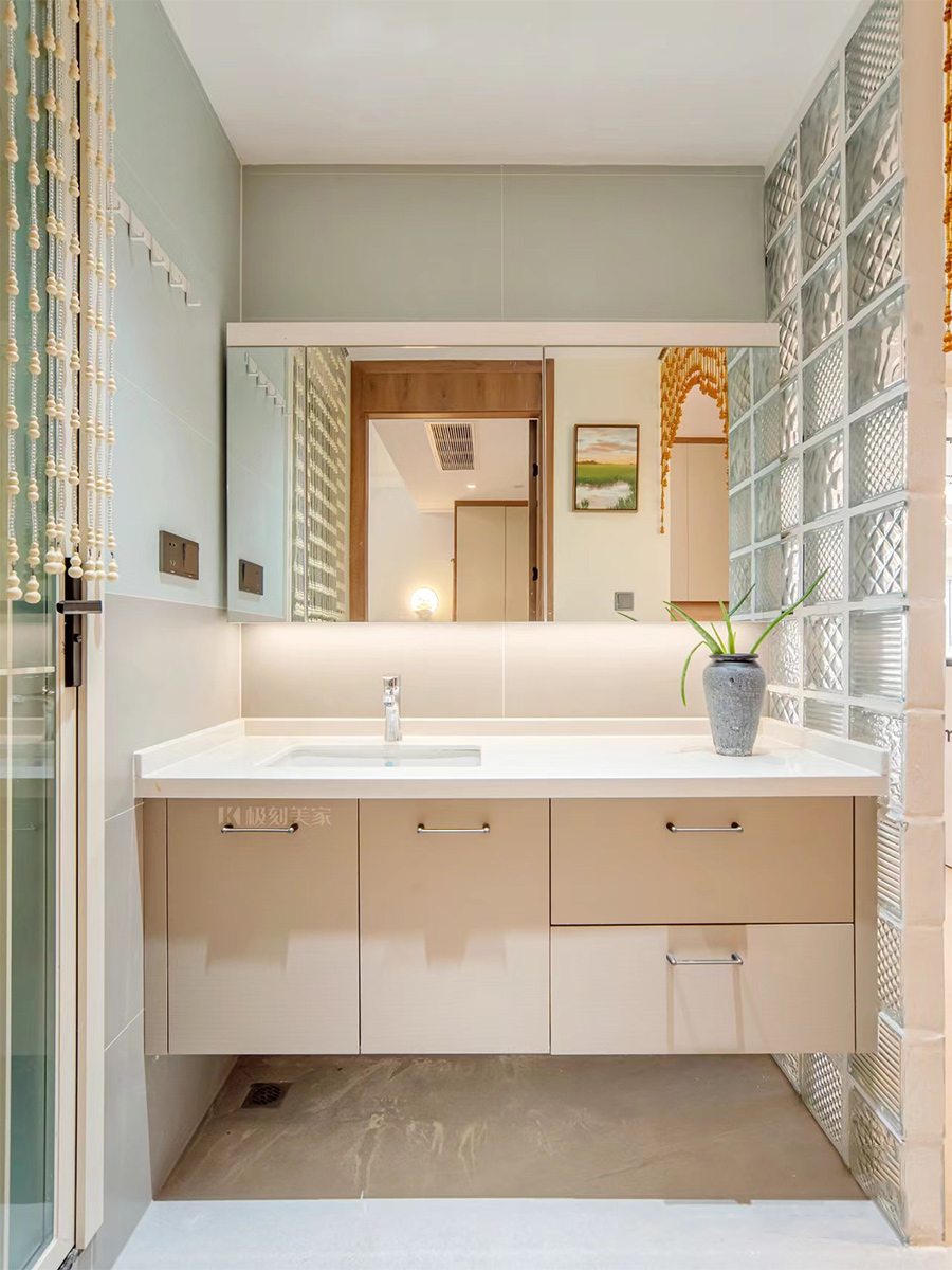 浴室柜用臺下盆,衛(wèi)生更好清理,兩邊用珠簾做隔斷,氛圍感十足
