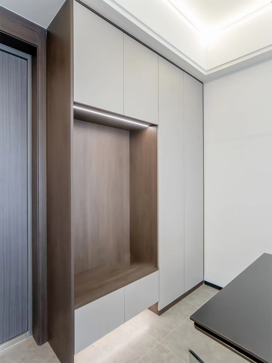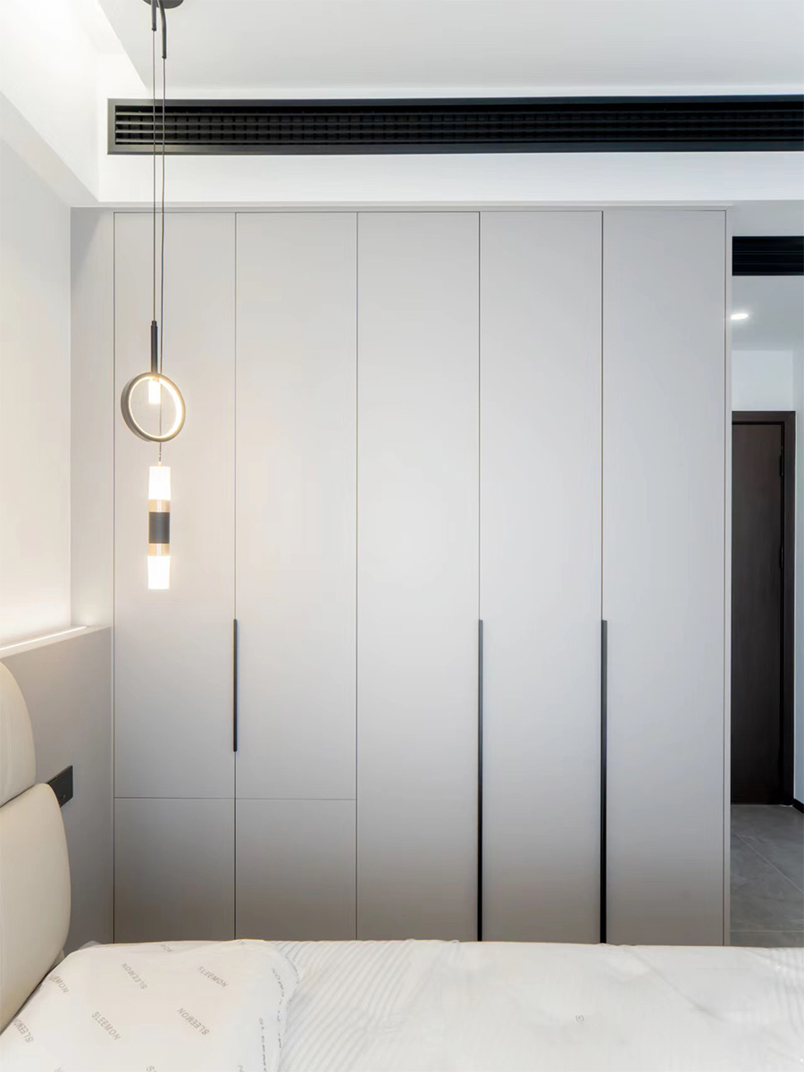 柜體采用18厚杉木芯板,柜門(mén)采用歐松板PET膚感柜門(mén),一門(mén)到頂,五金使用原裝進(jìn)口的百隆五金