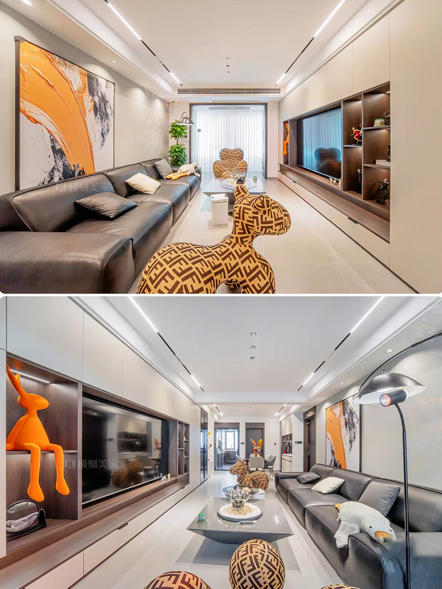 空間色調(diào)整體以黑白灰色系為主,為了不顯沉悶,增加了撞色設(shè)計
