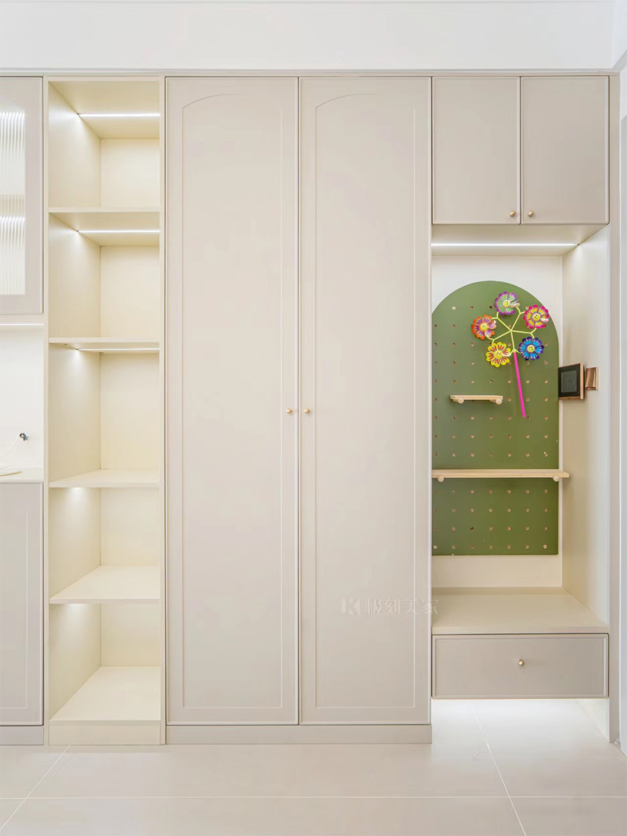 預(yù)留開放格位置,可隨手掛衣服、包包、鑰匙等日常用品,更增添幸福感