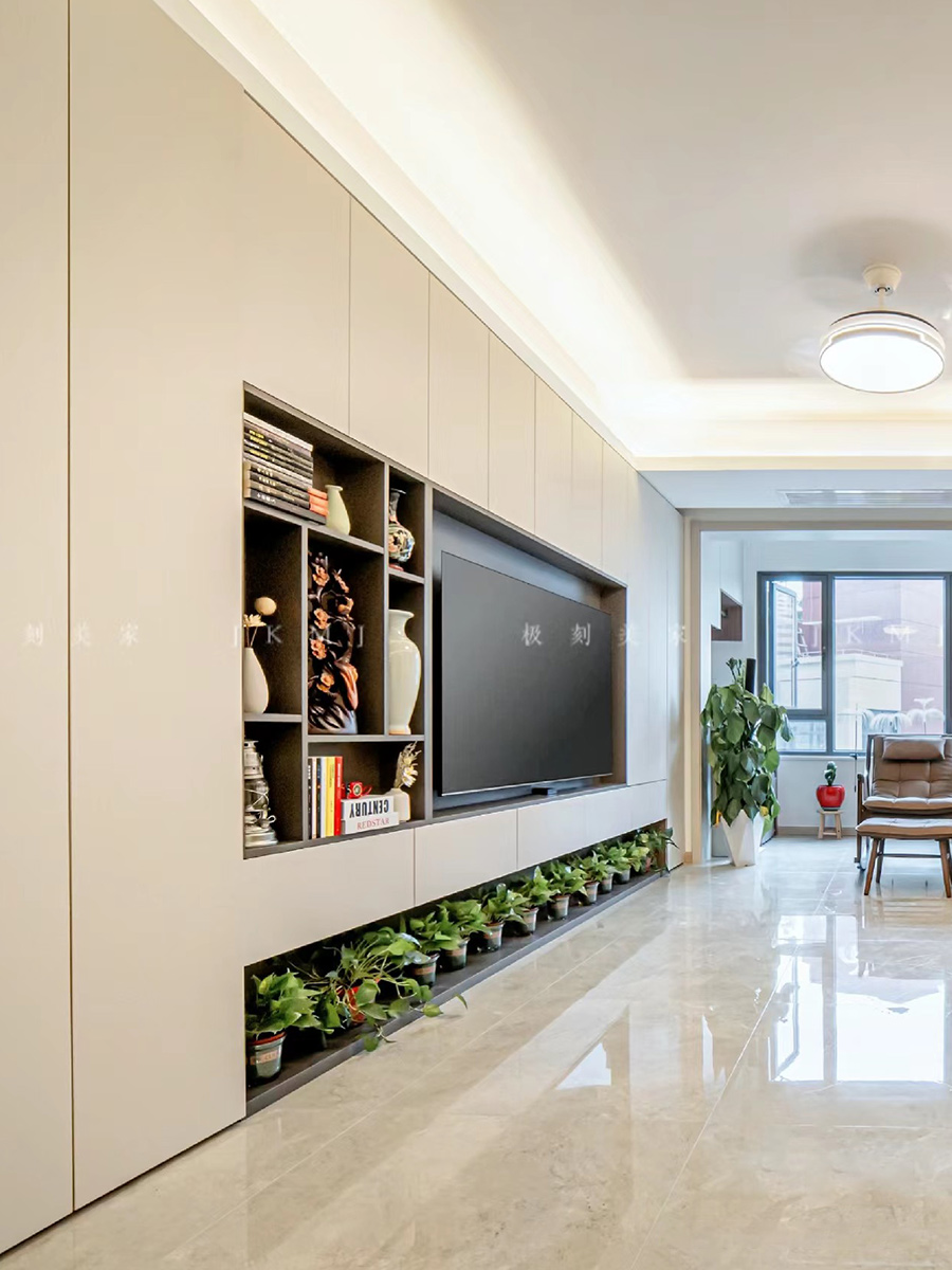 入戶柜連接餐邊柜、電視背景墻,充分利用空間,滿足收納需求