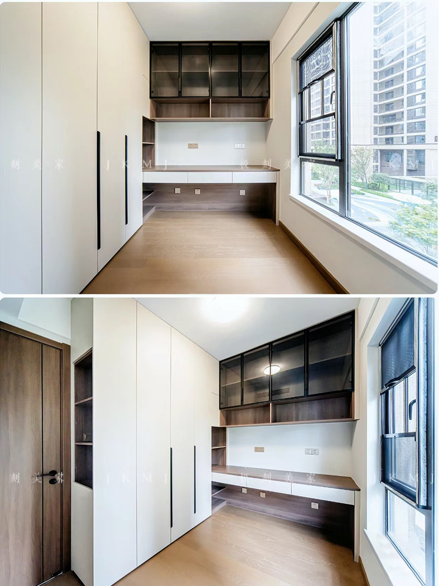 書房采用書桌衣柜一體化設(shè)計(jì),搭配玻璃柜門,更有層次感