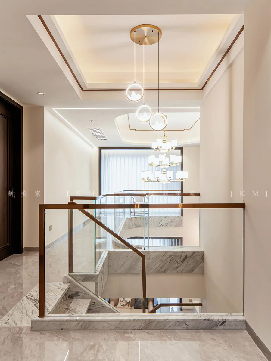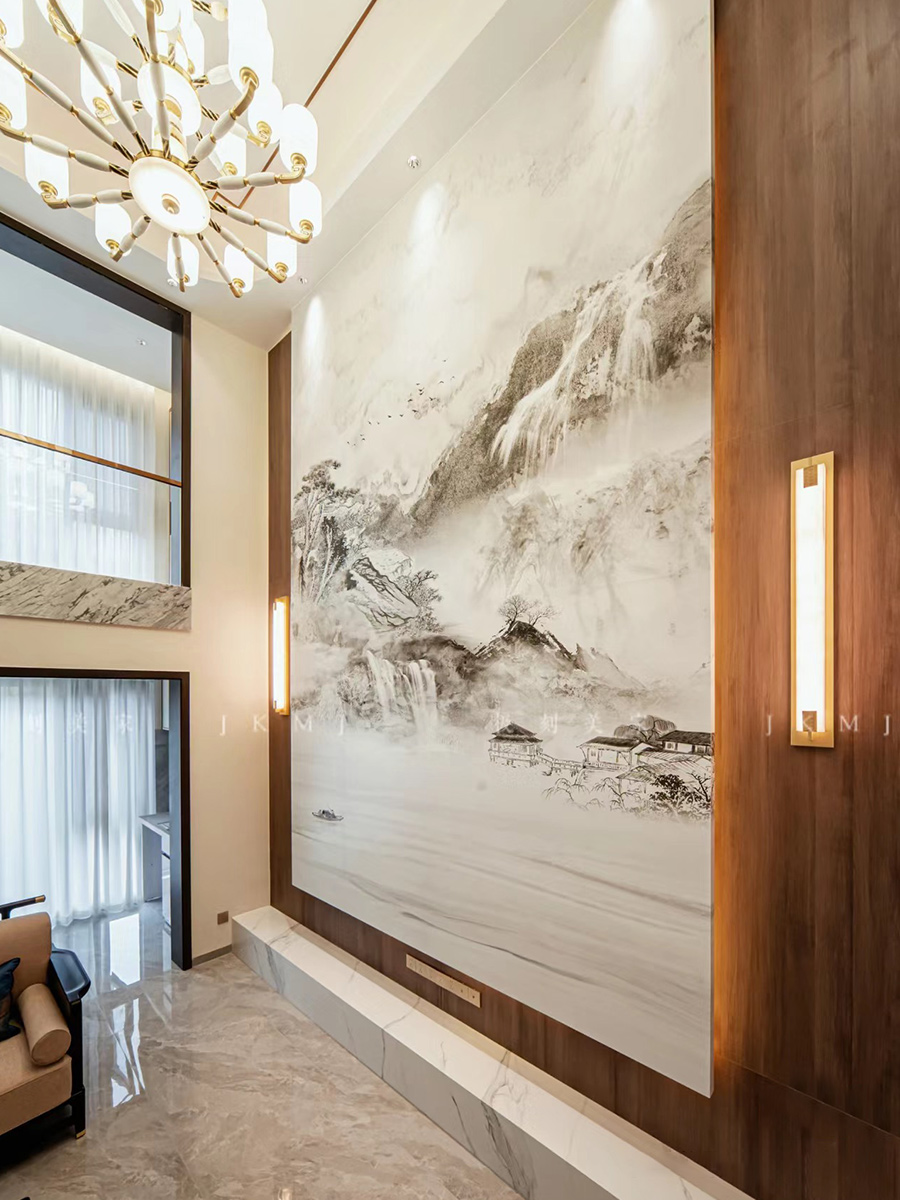 ??挑空的客廳江兩層的建筑空間打通,以中式葵紋為靈感、以國畫山水大理石做背景