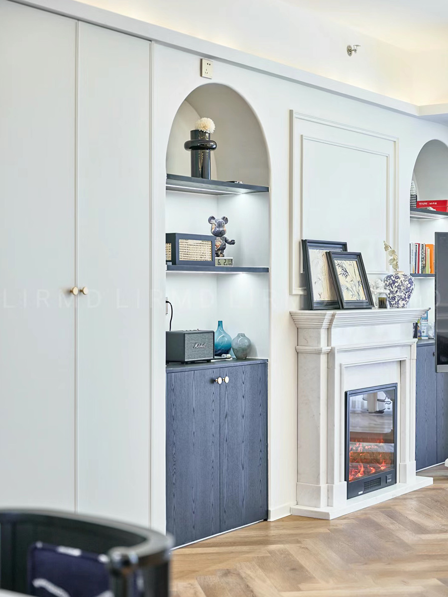 餐邊柜位置用寶格麗巖板做開放長格式設(shè)計搭配軌道插座,方便放置家用電器。上方長虹玻璃搭配,更加凸顯法式復(fù)古。搭配壁爐裝飾,更加凸顯高級奢華。