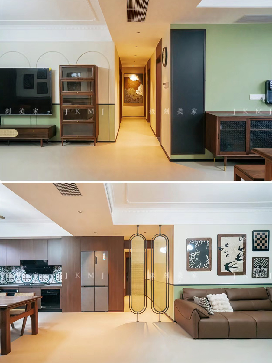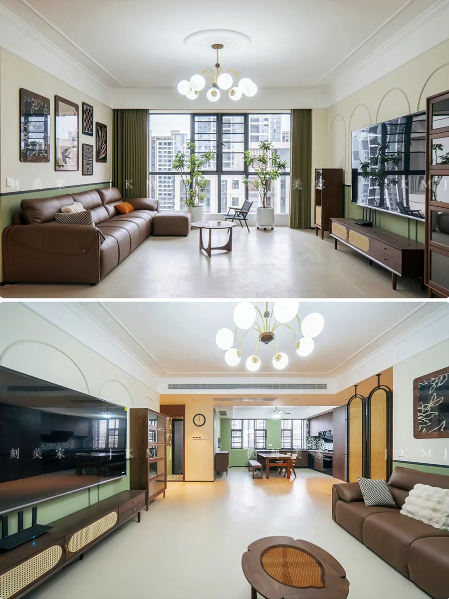 全屋用復(fù)古綠與奶咖色做撞色,融入花磚設(shè)計(jì),整體充滿故事感