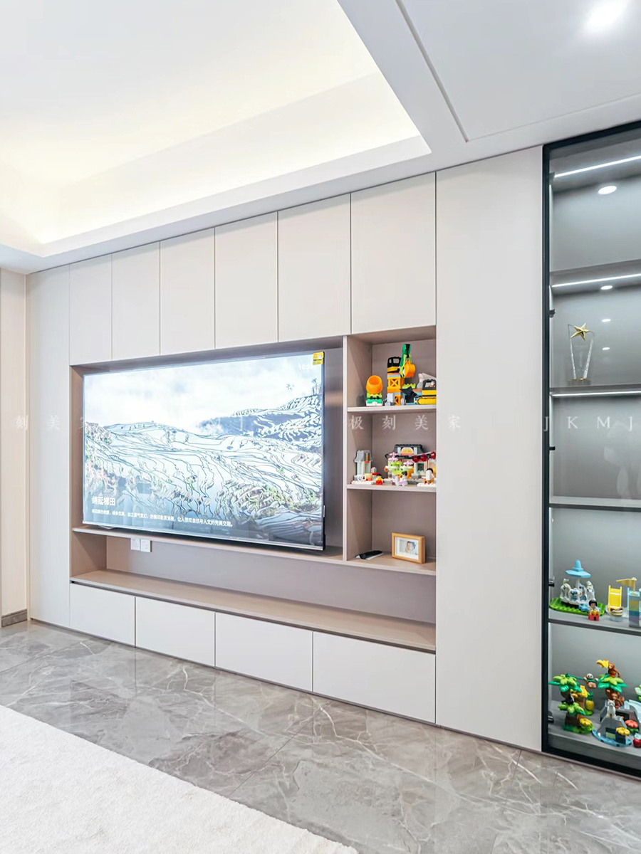 電視背景做滿墻柜子,搭配玻璃柜門,更有層次感