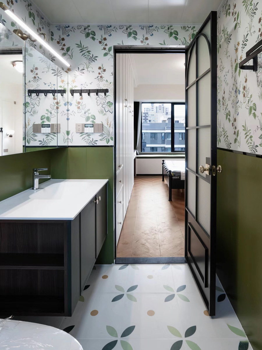 玄關(guān)封掉書房房門做了L型一個(gè)鞋柜,廚衛(wèi)采用花磚,浴室柜根據(jù)單獨(dú)空間的主題色來(lái)定制