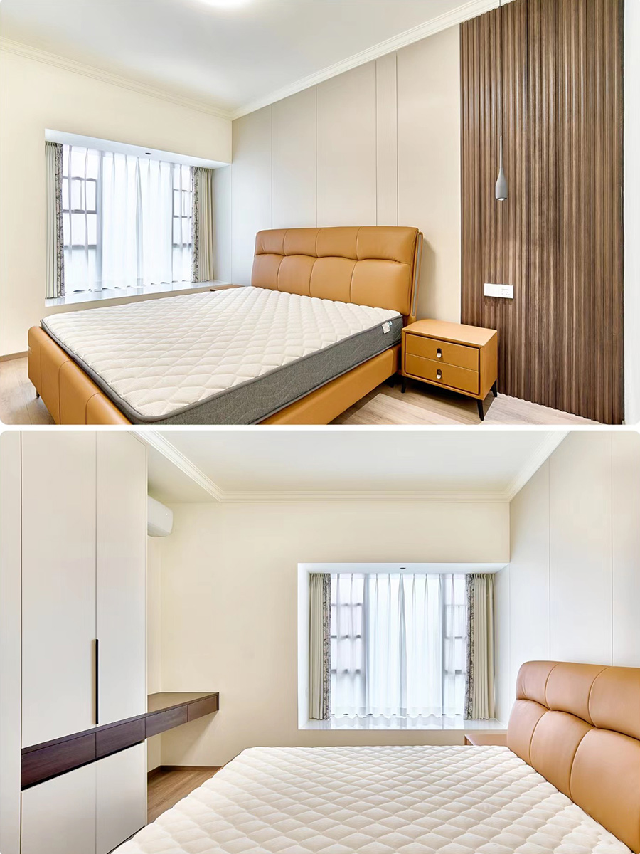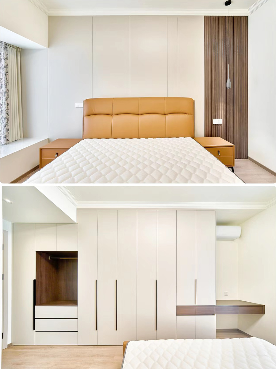 靠窗邊穿插設(shè)計一字長條懸浮梳妝臺,上方給空調(diào)留出空間,保持呼吸感