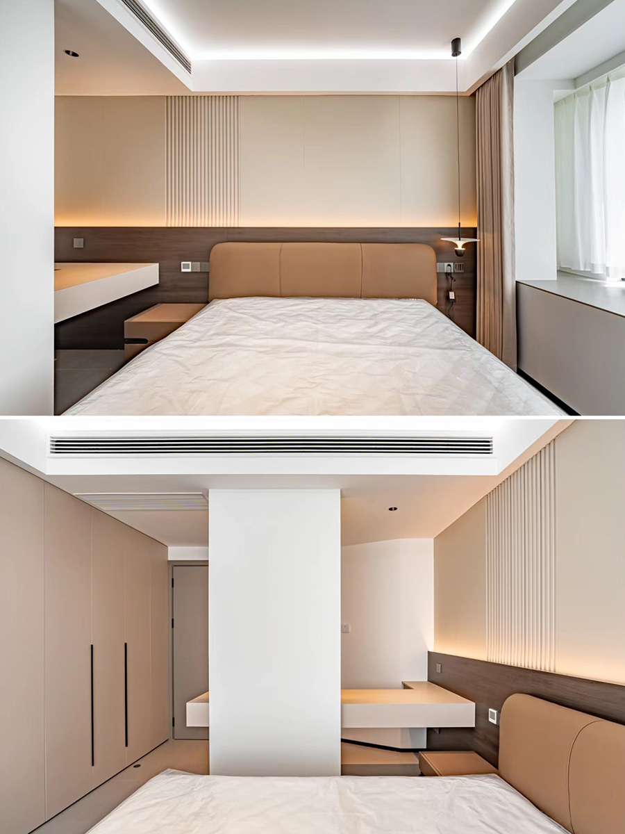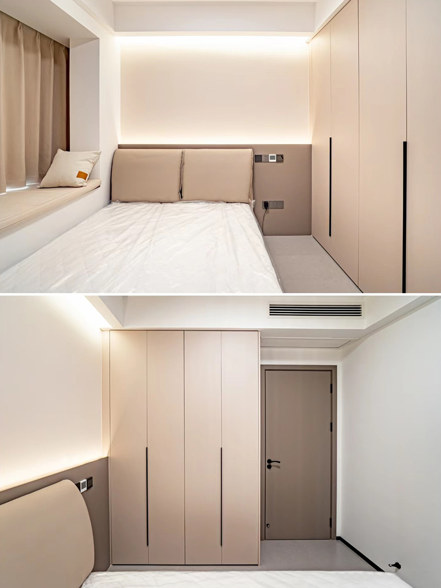 臥室床頭背景格柵+燈帶超有氛圍感。衣柜一門到頂顯品質(zhì)。