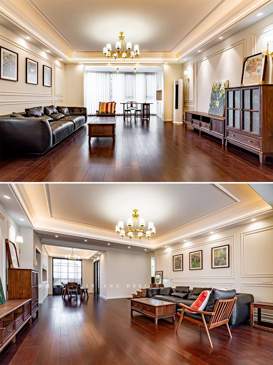 客戶家硬裝主要是法式復(fù)古風(fēng)格,深木色地板全房通鋪,家具也是選的同色系,石膏線墻面造型+復(fù)古吊燈、掛畫點(diǎn)綴,處處都是濃郁復(fù)古風(fēng)情。