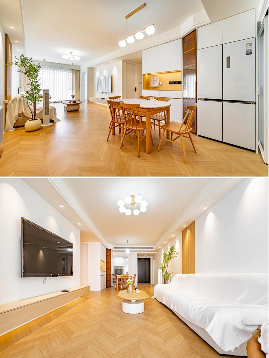 全屋定制柜用朗秋原木+膚感琥珀白搭配,深得原木奶油風格的精髓,耐看不易過時