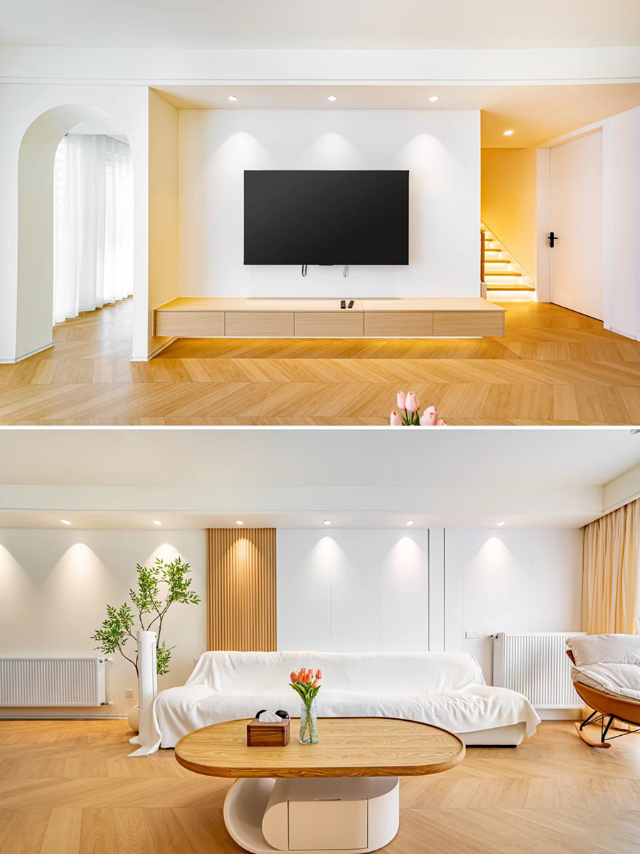 750*1500木紋磚通鋪,簡約懸浮電視柜,搭配同色沙發(fā)背景墻,簡約但有設計感。極窄雙眼皮邊吊,不壓層高,不積灰。