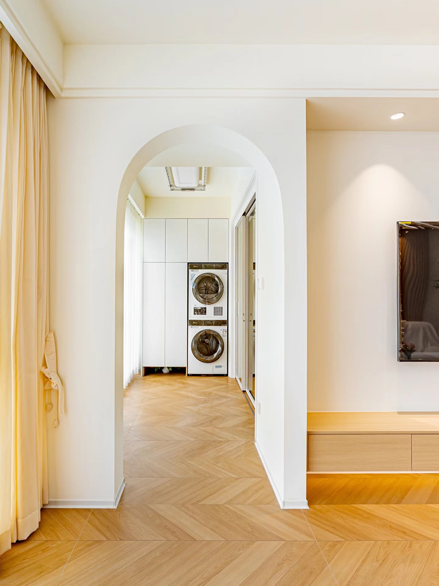 利用弧形門洞做陽臺區(qū)域劃分,一邊休閑區(qū)、一邊家政區(qū)。