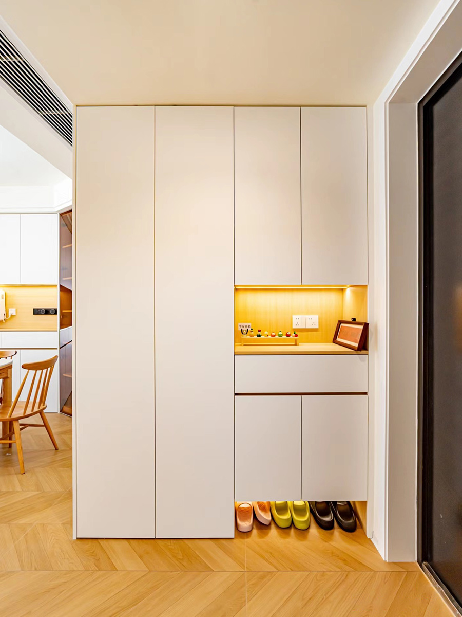 進門靠墻整面鞋柜,底面和中間留空,加上抽屜設計,換鞋、拿取物品都非常方便。