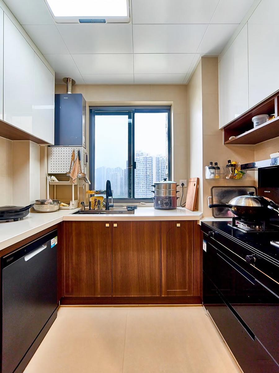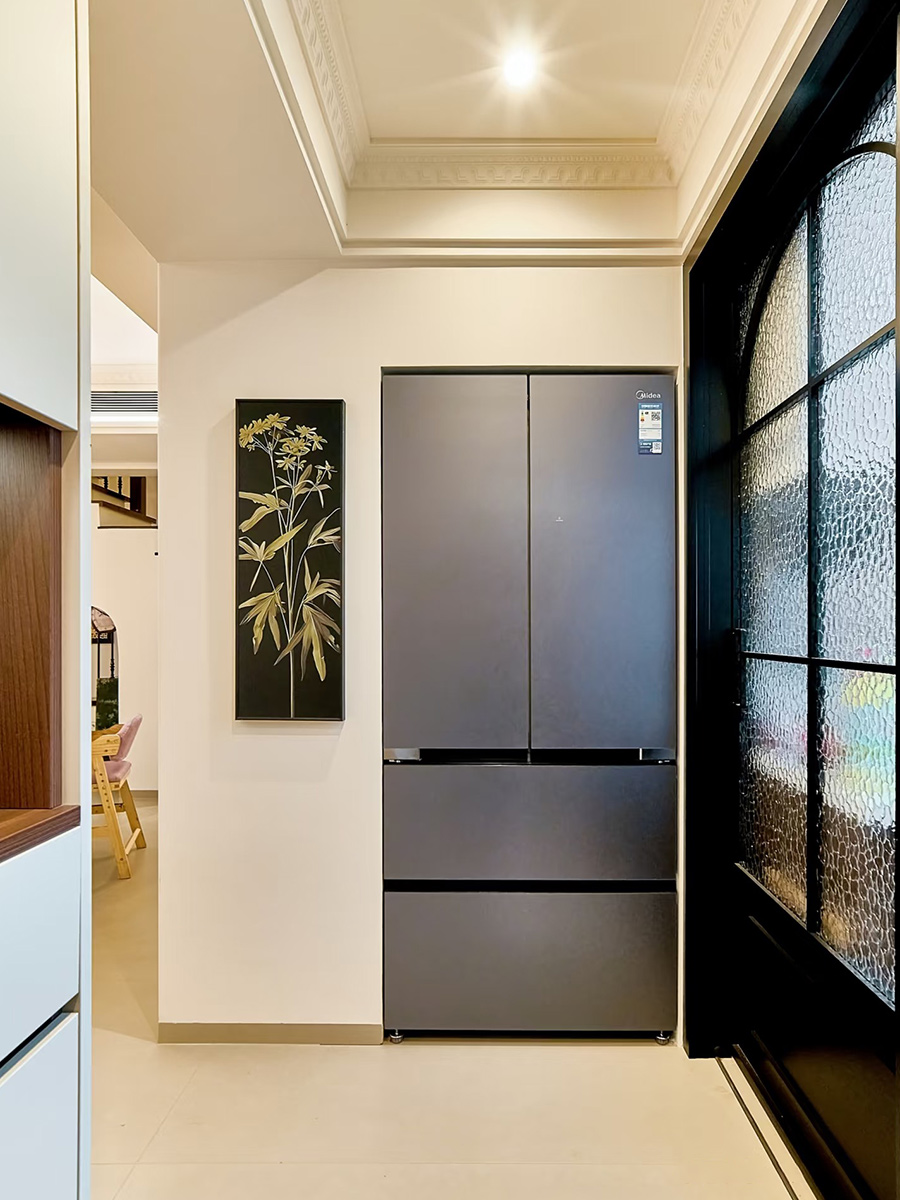 陽臺大膽加入圓弧拱門和廚房黑色玻璃推拉門,更加有復(fù)古調(diào)性