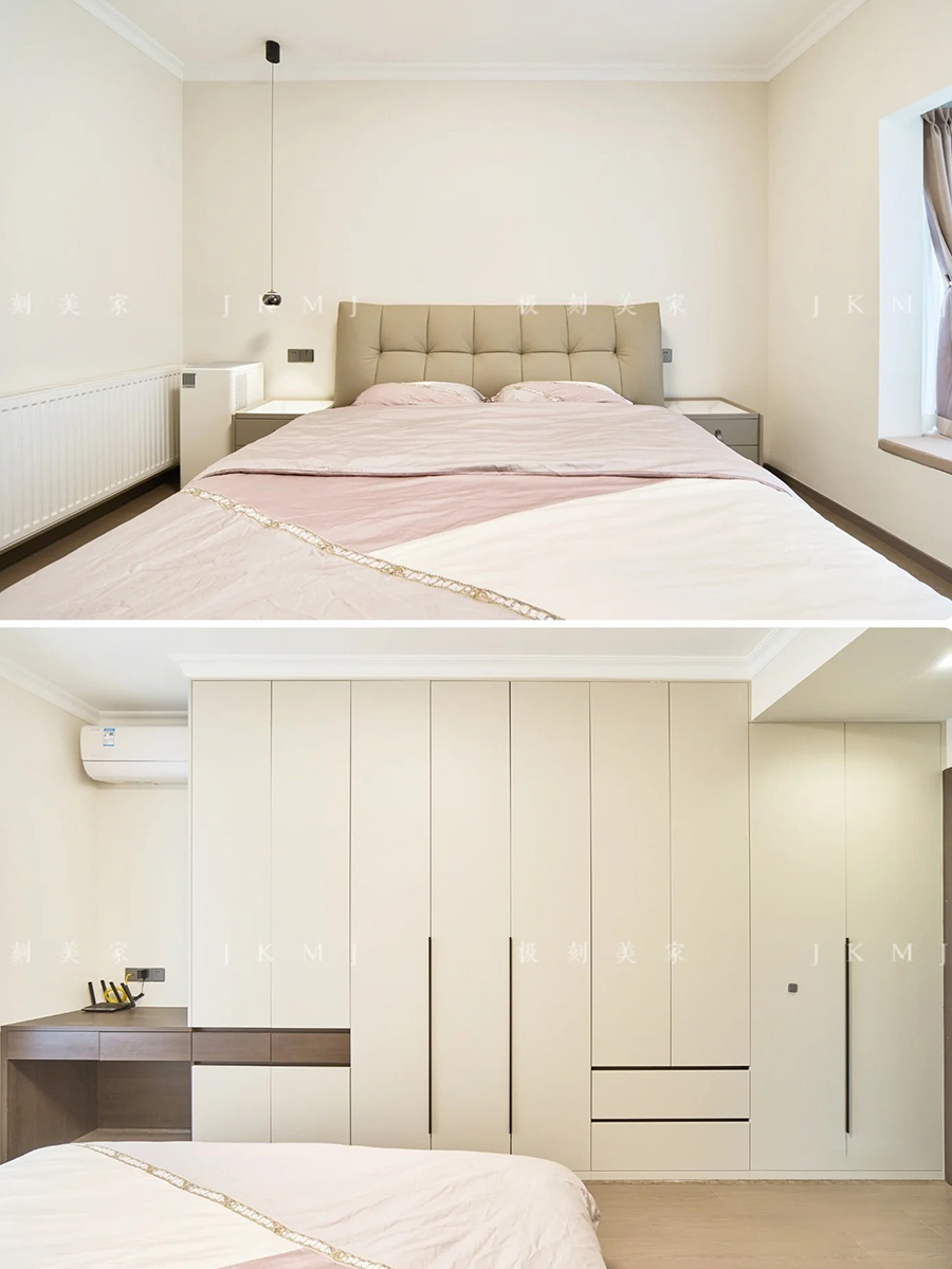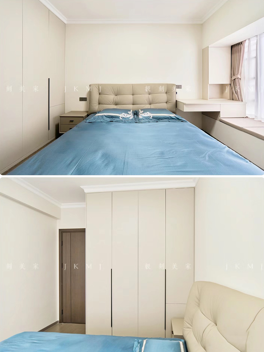 臥室做滿墻衣柜,充分利用飄窗空間,滿足客戶的收納需求