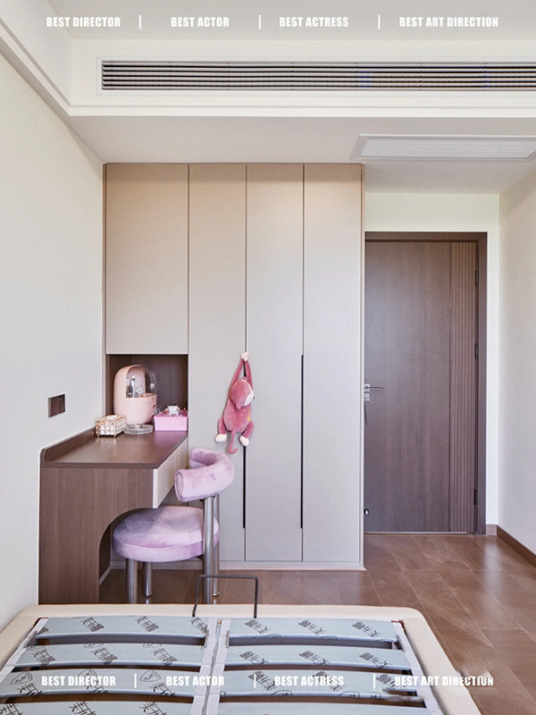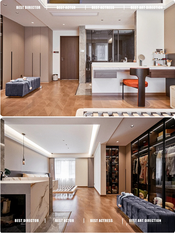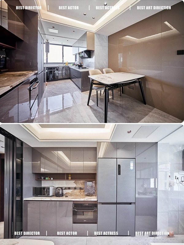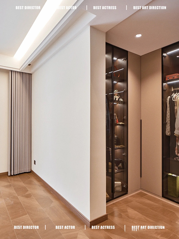 柜門(mén)采用奶咖閃銀LSB板PET膚感柜門(mén),一門(mén)到頂