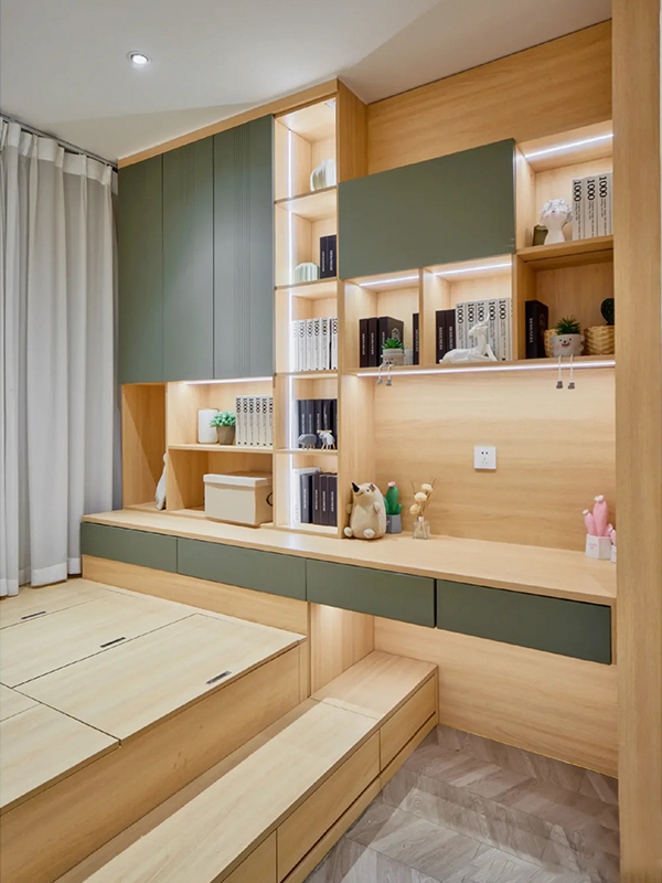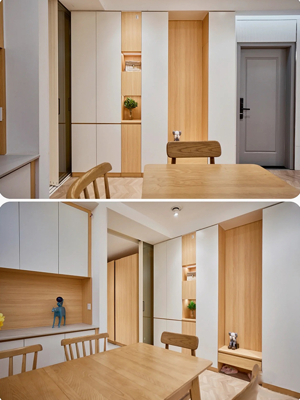 全屋定制:柜體板材是十環(huán)認(rèn)證萬象天冠足18厚杉木實芯板,柜門做的是歐松板模壓門;五金是奧地利進口百隆五金、徹底實現(xiàn)門墻柜一體化;