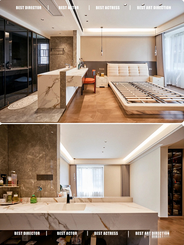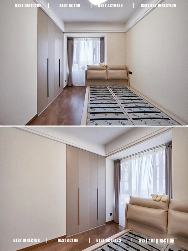 全房共定制了14個柜子,柜體采用足18厚杉木芯板,柜門采用LSB板PET膚感柜門,一門到頂,五金使用原裝進口的百隆五金