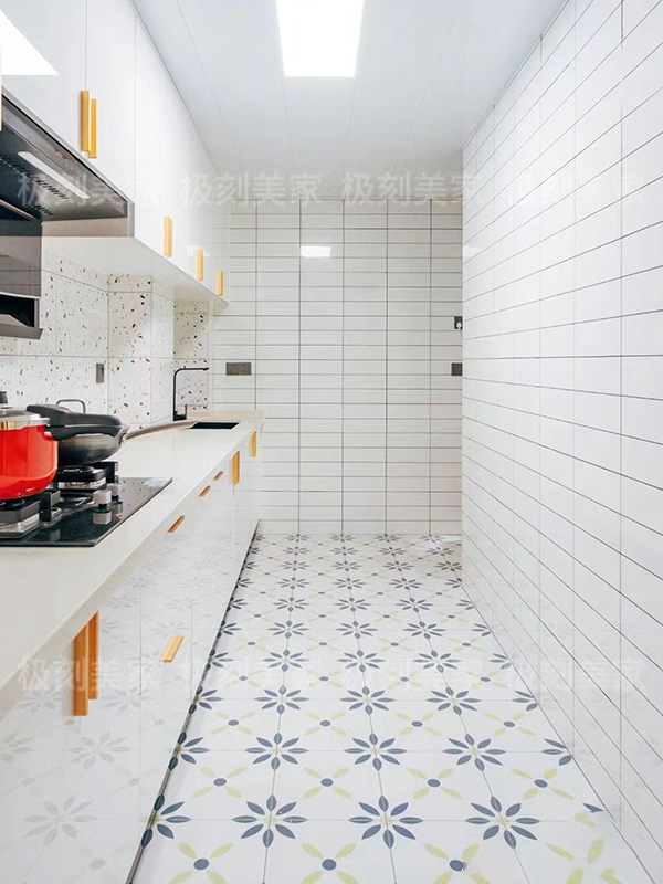 地面復(fù)古花磚的延伸感讓廚房看起來更大