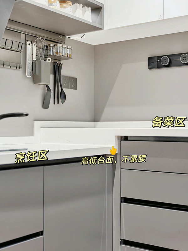 根據(jù)經(jīng)常下廚人的身高以及操作習(xí)慣做了高低臺(tái)面,洗菜、洗碗等不需要彎腰,炒菜的時(shí)候也不會(huì)累胳膊。