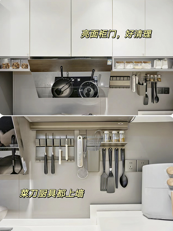做亮面柜門不做膚感或復(fù)雜造型,真的節(jié)省了很多打掃工作。常用廚具都掛起來(lái),隨用隨拿,不會(huì)堆放在臺(tái)面上。