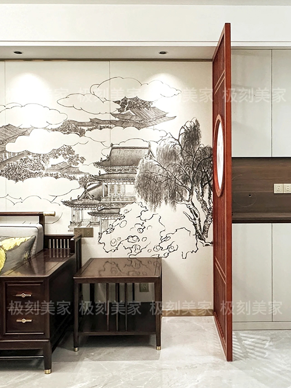 入戶柜與客廳用紅色屏風(fēng)隔斷,連接水墨畫背景,余韻十足